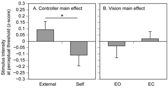 The stimulus intensity at the perceptual threshold expressed as z-score of residuals. Bars represent the mean and error bars represent the standard error of mean. An asterisk indicates a significant main effect (p < 0.05). EO, the eyes open; EC, the eyes closed.