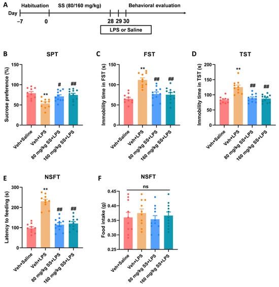 Figure 2. Prolonged treatment of SS improved depression- and anxiety-like behaviors caused by LPS. (A) Timeline of the experiment. (B) Sucrose preference of SPT. (C) Immobility time in FST. (D) Immobility time in TST. (E) Latency to feeding in NSFT. (F) Food stake in NSFT. Data were expressed as the mean ± SEM (n = 10–11 per group). ** p < 0.01 vs. Veh + Saline group; # p < 0.05, ## p < 0.01 vs. Veh + LPS group; ns means p > 0.05 no statistical difference.