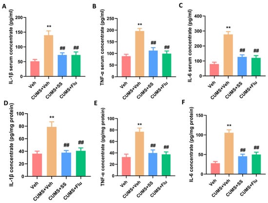 Figure 4. Chronic administration of SS reduced pro-inflammatory cytokine concentrations in the serum and hippocampus of CUMS mice. (AC) ELISA of IL-1β, IL-6, and TNF-α in the serum of each group. (DF) ELISA of IL-1β, IL-6, and TNF-α in hippocampus of each group. Data were expressed as the mean ± SEM. ** p < 0.01 vs. Veh group; ## p < 0.01 vs. CUMS + Veh group; ns means p > 0.05 no statistical difference.