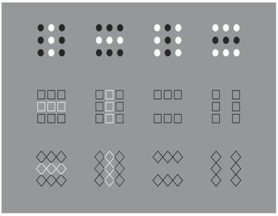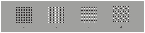 To perturb the stability of the percept while preserving the proximity principle, dissimilarity can be introduced between rows and columns. Figure 1b,c demonstrate differential grouping achieved through contrast polarity reversal [,]. Under these conditions, observers report perceiving alternating columns or rows of achromatic dots. In Figure 1d, diagonal grouping is accentuated through strategic manipulation of contrast polarity. This novel grouping mechanism operates independently of the proximity principle, as the inter-element distances along the diagonal exceed those along the cardinal axes. Wertheimer [,] attributed these groupings to the similarity principle, which states that all else being equal, perceptually similar elements tend to be integrated into a cohesive group.