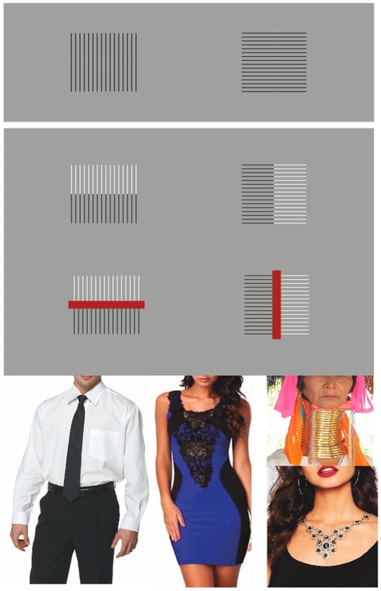 - Thompson, P.; Mikellidou, K. Applying the Helmholtz illusion to fashion: Horizontal stripes won’t make you look fatter. I-Perception 2011, 2, 69–76. [Google Scholar] [CrossRef]