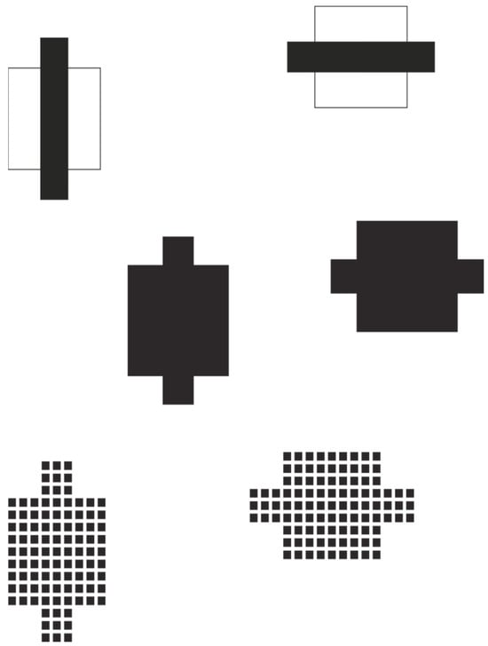 To further elucidate the perceptual effects achievable through accentuation, we examine additional examples. In Figure 5 (first four rows), the introduction of dissimilar elements to geometric squares, either internal (black rectangles) or external (dots), results in the accentuation of direction and position relative to the geometric shapes along their sides or angles. This gives rise to the rotated square–diamond effect: the large shapes in the first and fourth rows are perceived as diamonds, while those in the second and third rows appear as rotated squares []. Although geometrically identical, a square rotated 45 degrees and a diamond are phenomenologically distinct. The former emphasizes its square nature, appearing flattened along its sides, while the latter accentuates its angles and vertices. This demonstrates that a square comprises sides and angles that can be alternately emphasized through accentuation, suggesting that it inherently contains two potential forms, either of which can be highlighted through the principle of accentuation [,,,,,].
