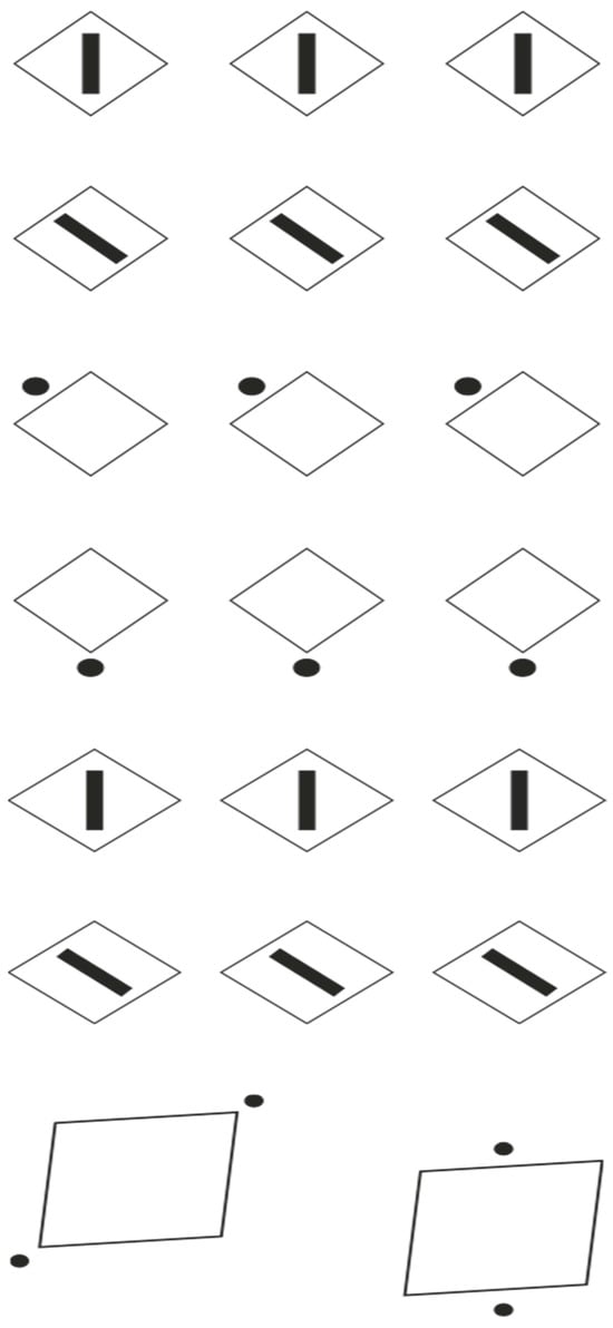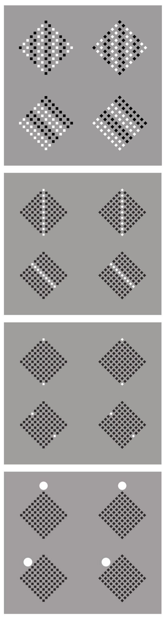 In the bottom row, a perceptual inversion occurs: the squares are perceived as diamonds (left), and the diamonds are perceived as rotated squares (right). Correspondingly, the global diamond shapes in both conditions are perceived as large rotated squares. In these instances, the direction of grouping highlights the attribute that contrasts with the geometrical shape, angles instead of sides, and sides instead of angles. In these cases, the interaction between local and global configurational processes constrains the perceptual result [].