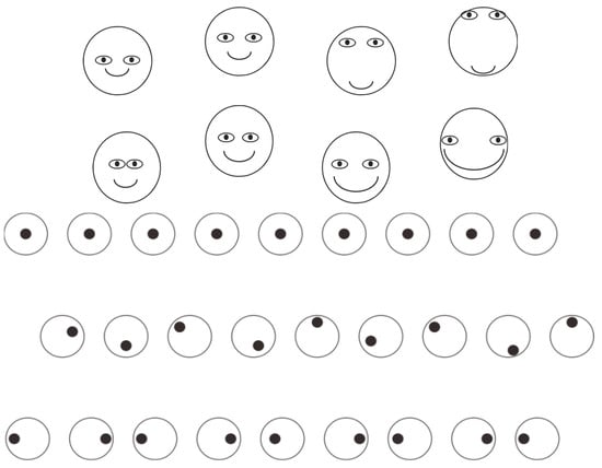 The role of accentuation, as an independent principle from the classical Gestalt ones, becomes more and more salient in Figure 8—second, third, and fourth row, where the perceptual organization based on similarity is gradually reduced to the limiting case of an external circle that is totally dissimilar and independent from the set of elements.