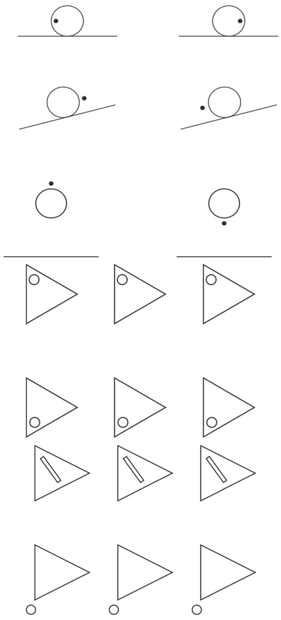 The ball is following the dot (first group). Despite the configural orientation effect indicating a rightward direction, the equilateral triangles are perceived as pointing upward in the first row and downward in the second (second group). Isosceles triangles appear as scalene triangles due to accentuation (third group).
