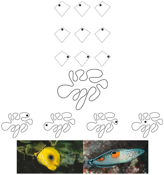 Just as ties, necklaces, necklines, and other pendants elongate and slim the human body, natural accentuators, such as ocelli found in the markings of many organisms, starting with butterflies, enhance adaptive fitness by altering shape and expressive qualities, similar to the amoeboid form previously described. These accentuators serve vital biological functions, such as facilitating predation by altering the organism’s appearance to deceive prey or evade predators (see Figure 9-third group). Moreover, these modifications play a crucial role in sexual selection by enhancing traits that are attractive to potential mates []. This strategic use of accentuators for survival and reproduction is consistent with principles of perceptual organization and visual camouflage, as discussed in the introduction.