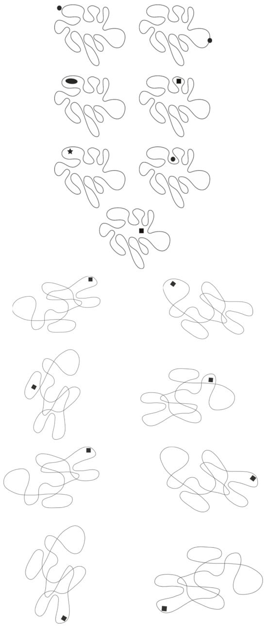 We might ask how many possible shapes can be accentuated with this kind of object. Undoubtedly, there are many more than those found in the square or irregular quadrilateral. One could also question whether the dot functions like an eye, attributing head-like characteristics to the region where it is placed, with the body following. It is likely that this attribution occurs, but not because the dot resembles an eye. This can be demonstrated by the examples shown in the first group of Figure 10, where the accents do not resemble eyes yet still function similarly to the dot.
