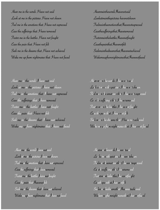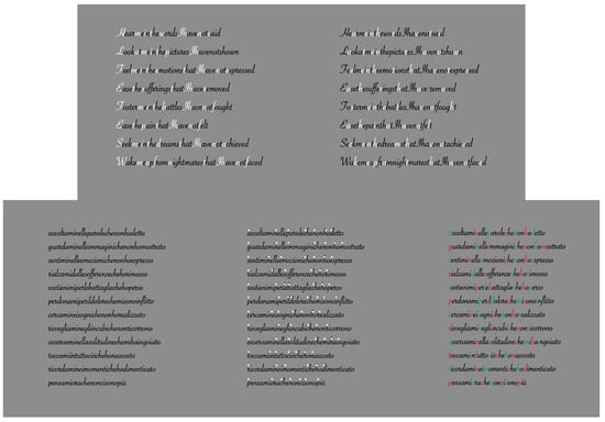 One final effect, though no less important, is that accents can either facilitate or hinder the reading process. In Figure 11, several conditions are shown in which accentuating entire words or specific letters in different positions through contrast polarity, whether or not spaces between words are present, can either ease or complicate the reading process, affecting reading speed or increasing the likelihood of errors. Similar effects are achieved using different colors or placing dots above individual letters. In all these cases, the role of accents as attractors and focal points for attention is evident.