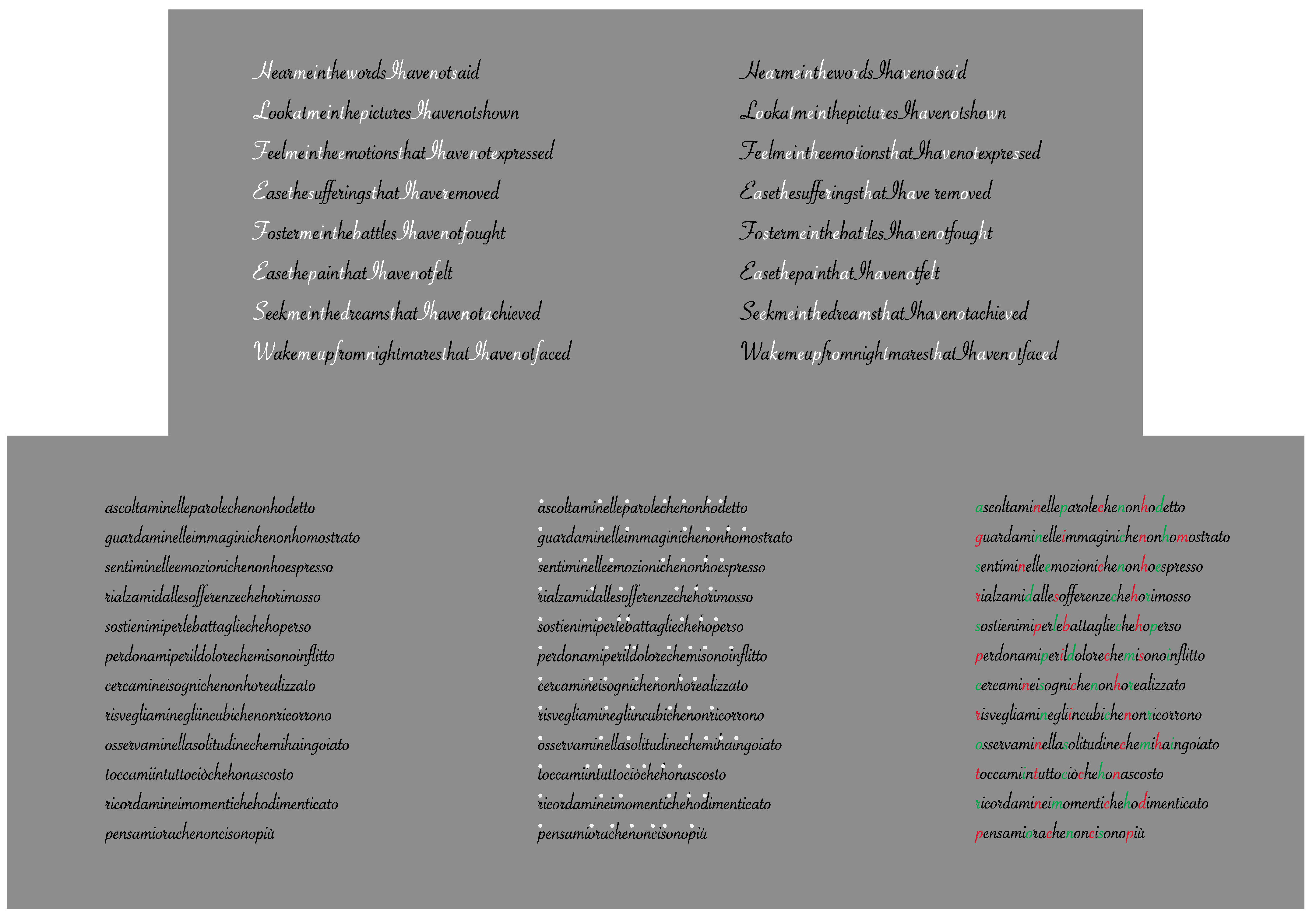 Figure 11, several conditions are shown in which accentuating entire words or specific letters in different positions through contrast polarity, whether or not spaces between words are present, can either ease or complicate the reading process, affecting reading speed or increasing the likelihood of errors. Similar effects are achieved using different colors or placing dots above individual letters. In all these cases, the role of accents as attractors and focal points for attention is evident.