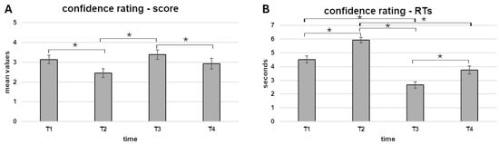 (A,B). Behavioral results. (A) The bar graph shows a higher confidence score in the choice in T1 compared to T2, and in T3 compared to T2 and T4. (B) The bar chart displays higher RTs for T1 compared to T3, as well as higher RTs in T2 compared to T1, T3, and T4. Also, higher RTs were found in T4 compared to T3. Bars represent standard errors. Stars mark statistically significant differences (p ≤ 0.005).