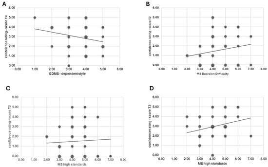(A–D). Correlational results for psychometric measures and response score. The scatterplots represent a significant (A) negative correlation between GDMS-dependent style and confidence response score in T4; (B) positive correlation between MS Decision Difficulty and confidence response scores in T2; (C) positive correlation between MS High Standard and confidence response scores in T2; (D) positive correlation between MS High Standard and confidence response scores in T1.