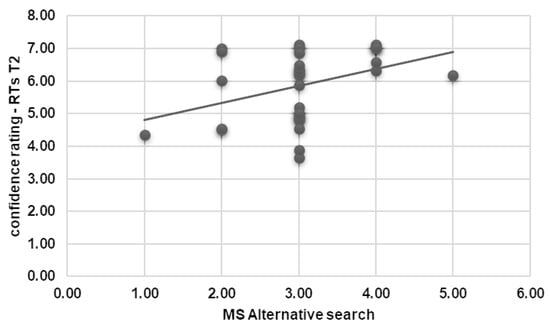 A positive correlation was also found between MS Alternative Search and the RTs in T2 (r = 0.376, p = 0.034) (Figure 4). No other significant correlations were found.