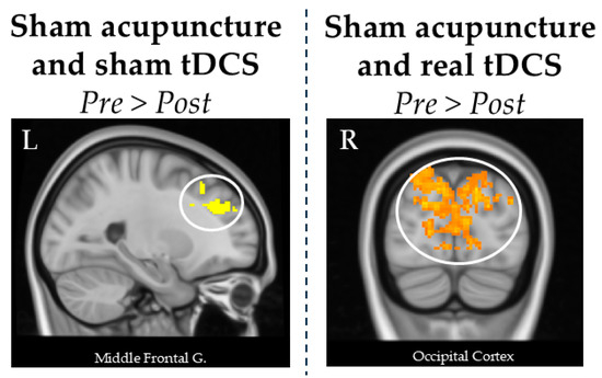 In the contrast between pre- vs. post-tDCS treatment, sham tDCS and sham acupuncture led to a decrease in the CBF in the left lateral occipital cortex and left middle/superior frontal gyrus. No significant results were found in the opposite contrast.