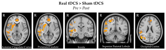 Comparing pre- and post-treatment differences between the real and sham tDCS groups. The difference highlights regions where the post-treatment minus pre-treatment change in CBF is greater in the real tDCS group compared to the sham group. We found that the real tDCS led to a larger increase in the bilateral anterior cingulate cortex, right putamen/caudate, right insula, right superior parietal lobule, and right occipital cortex. All these brain regions are shown in the circles of the figures.