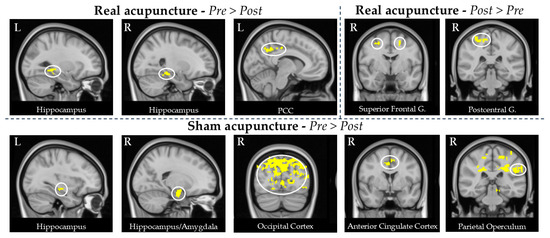 Statistical analysis of the CBF changes for the real and sham acupuncture groups. Real acupuncture led to decreased CBF in the bilateral hippocampus and left posterior cingulate cortex (PCC). In addition, increased CBF in the bilateral superior frontal gyrus and right postcentral gyrus were detected. Sham acupuncture was associated with decreased CBF in the bilateral hippocampus, bilateral occipital cortex, bilateral anterior cingulate cortex, and left parietal operculum. All these brain regions are shown in the circles of the figures.