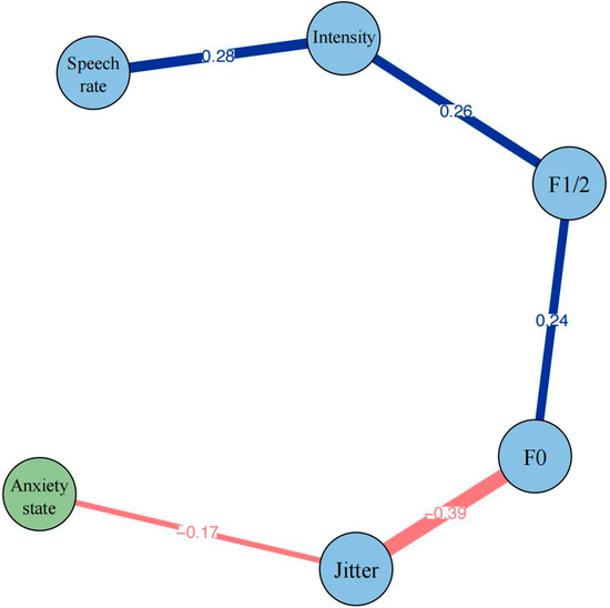 Network structure of anxiety state and speech indicators in total group. Blue edges represent positive correlations and red edges represent negative correlations. The thickness of the edge reflects the magnitude of the correlation. The value on the edge represents the edge weights of two corresponding nodes.