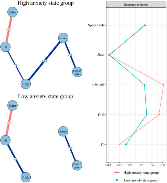 In the speech indicator network of the high-anxiety-state group (see upper left of Figure 2), the pattern of connections between speech indicators is very similar to that in Figure 1. Three positive connections are, respectively, speech rate–intensity (edge weight = 0.28), intensity–F1/2 (edge weight = 0.33), and F1/2–F0 (edge weight = 0.20). Only one strong negative connection is between jitter and F0 (edge weight = −0.39). In the speech indicator network in the low-anxiety-state group (see lower left of Figure 2), except for the absence of a connection between intensity and F1/2, the connection patterns between the other indicators remain similar to the high-anxiety group. Bootstrapped 95% confidence intervals indicate that the edge weights in the two samples are relatively accurate (Figure S2a,c in the Supplementary Materials). Figure S2b,d show the edge weights’ difference test results.