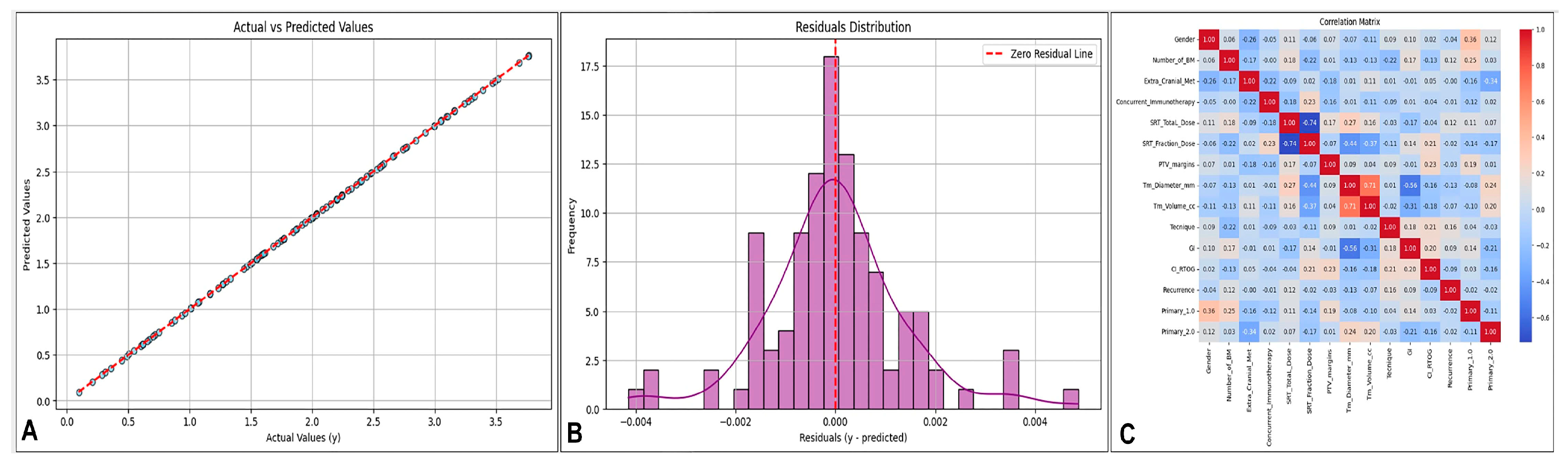 Figure 2. (A) Scatter plot. (B) Residuals distribution. (C) Heat map.