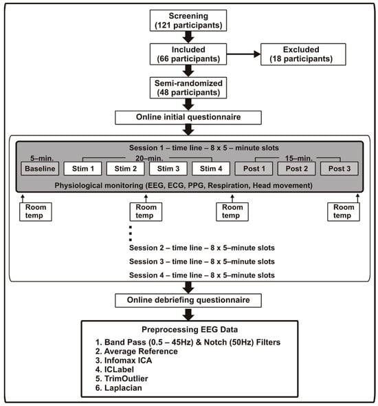 One hundred twenty-one participants were screened from healthy staff and students at the University of Hertfordshire (UH), local complementary health practitioners, and other contacts who volunteered to participate in this study. Sixty-six healthy volunteers participated in the study and completed preliminary online questionnaires. After receiving an explanation of the study protocol, they were required to attend the University Physiotherapy Laboratory for four TEAS sessions, spaced a week or more apart in order to avoid any carryover effect as far as possible [53]. Four participants who dropped out after only one session and another who completed only three sessions were excluded. Another 14 participants were excluded, either because of inadvertent differences in sampling rate (for four participants, in four sessions) or missing or poor-quality data, or because recordings were cut short for one reason or another (e.g., discomfort from wearing the cap or having to take a trip to the bathroom). Thus, 48 subjects were included in the analysis. Figure 1 shows the sequence of the screening, data collection, and preprocessing pipeline.