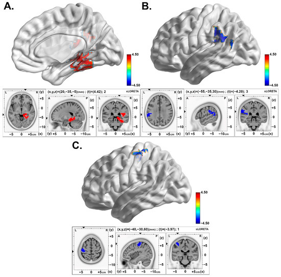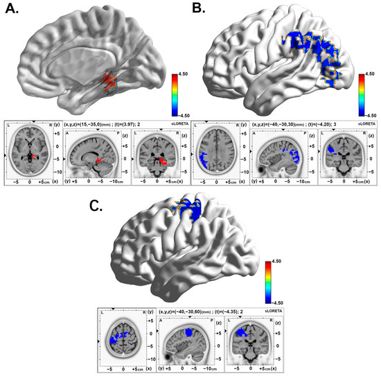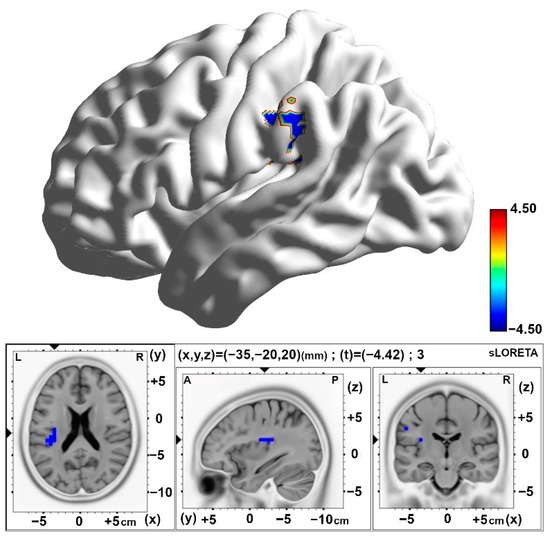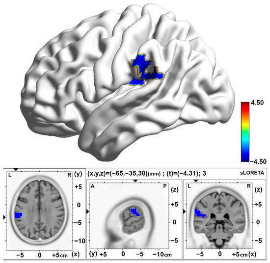 After the EEG preprocessing steps and artifact removal, we sought to determine the current sources. Source localization analysis refers to the process used to estimate the current sources in the brain from measured EEG data, applying computational methods to solve the inverse problem [43]. The standardized low-resolution brain electromagnetic tomography (sLORETA) method was used to determine the source localization distribution based on images of standardized current density [61,62].