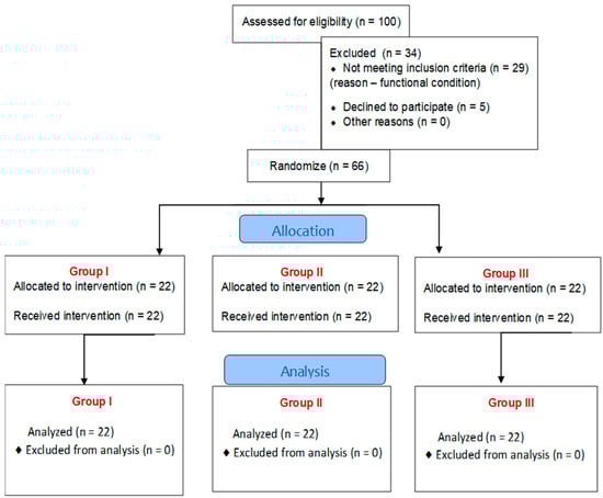 One hundred post-stroke patients were selected to participate in the study. Of these, 34 patients did not meet the inclusion criteria, including 29 due to their functional condition, and 5 people refused to participate in the study. The remaining 66 patients were recruited and divided into three groups, each of which received different treatments.