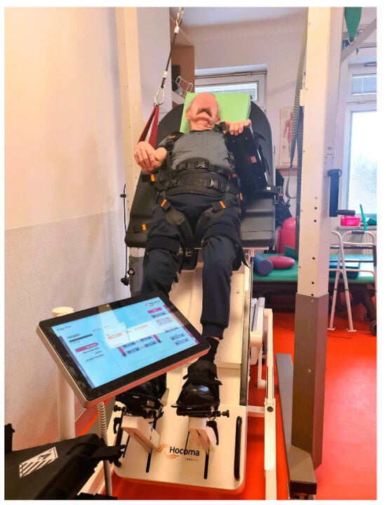A Luna EMG (a rehabilitation diagnostic robot developed by EGZOTech, Gliwice, Poland) was used to measure muscle tension (measurement accuracy [−1–+1 V+/−1 µV]) [30,31].