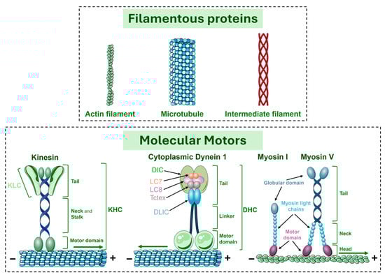 Schematic representation of the primary groups of cytoskeletal filament proteins and their associated molecular motors. (Top): The cytoskeleton is composed of actin filaments, microtubules (formed from α- and β-tubulin subunits), and intermediate filaments, which provide structural support and intracellular transport pathways. (Bottom Left): Kinesin structure. Kinesins are microtubule-associated motor proteins responsible for transporting cargo toward the plus ends of microtubules (with the exception of kinesin-14, which moves toward the minus ends, and kinesin-13, which does not engage in directional transport but instead regulates microtubule dynamics). They typically function as dimers, each composed of kinesin heavy chains (KHCs) with motor domains at the N-terminal ends. A neck linker connects these motor domains to the stalk region, and the tail region facilitates the binding of kinesin light chains (KLCs) and cargo. (Bottom Center): Cytoplasmic dynein 1 structure. Dynein is the primary motor protein that transports cargo toward the minus ends of microtubules. The dynein complex consists of a dimer of dynein heavy chains (DHCs), which generate force for movement. The structure is further stabilized by dimers of dynein intermediate chains (DICs) and dynein light intermediate chains (DLICs) that associate with the DHCs. Additionally, dimers from the three dynein light chain (DLC) families, Roadblock (Robl/LC7), LC8, and Tctex, bind to the N-terminal regions of the DICs. (Bottom Right): Myosin I and myosin V structures. Myosins are actin-based motor proteins, with most (except myosin VI) moving toward the plus ends of actin filaments. Myosin I functions as a monomer, while conventional myosins, including myosin V, operate as dimers. Both myosin types typically include a motor domain that generates force, a neck region that binds myosin light chains, and a tail domain that interacts with cargo (myosin V) or the membranes (myosin I) or organelles (as observed with myosin V).