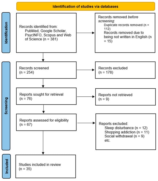 Out of these 254, 178 records were excluded after screening, which resulted in 76 papers being sought for retrieval. Of these, 9 papers were irretrievable, which then left 67 papers that were assessed for eligibility. Inclusion criteria were used to select studies that were directly related to concepts such as “brain rot” and cognitive decline due to overuse of digital technology, particularly among adolescents and young adults. Exclusion criteria were set to eliminate studies that were unrelated to this topic, such as articles on sleep disturbances, shopping addiction, or social withdrawal. This multi-step process was effective in ensuring that the final studies were relevant and methodologically sound, adding considerably to the insights into the cognitive impacts of excessive screen time. Finally, 35 papers were included in the review. Figure 2 illustrates the data selection process according to the PRISMA flow diagram.