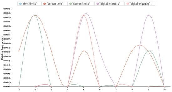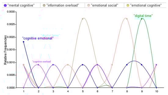 The recognition of brain rot as a phenomenon is shaped by the amount and nature of digital engagement [25]. In this respect, overwhelming consumption, especially by adolescents and young adults, of social media, video streaming, and instant messaging may lead to mental fatigue. By analyzing the relationship between the most frequently repeated words, it was found that several terms were found to affect the clarity of brain rot, as depicted in Figure 3, namely, mental cognitive, information overload, emotional social, and emotional cognitive. Figure 3 reveals the relative frequencies of the four keywords: “mental cognitive”, “information overload”, “emotional social”, and “emotional cognitive” within a predefined range, depicting notable trends in their usage as Term Frequencies (TFs). Each TF represents the raw frequency of a specific term in the corpus, while the Document Count (DC) on the x-axis indicates the number of terms across all documents. A Relative Frequency is calculated by dividing the TF by the DC, typically expressed as a percentage. Each colored curve illustrates ups and downs in the popularity of these terms; noticeable peaks denote periods of higher relevance. For instance, the “information overload” curve is spiky, which means that information overload will continue to worsen in this social media era, wherein adolescents and young adults are bombarded with an overwhelming volume of content daily. This usually contains low-quality information that may mask meaningful insights and make credible sources hard to discern. This might heighten anxiety and decrease attention span, which could reduce the ability to process and engage with the wealth of information available. In contrast, the “emotional social” and “emotional cognitive” curves display more consistent yet moderate patterns of usage, signifying ongoing engagement with these themes, but without the same intensity or rapid shifts.