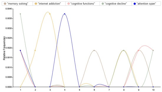 Text analysis reveals that internet addiction behaviors are closely associated with cognitive decline, particularly in areas such as memory, attention span, and problem-solving abilities, highlighting the impact of excessive digital use on cognitive function, as depicted in Figure 5. These curves show the different emphases on various cognitive aspects related to brain rot. For example, the “cognitive decline” and “attention span” curves are high, indicating high levels of concern about these issues at one point in time, probably due to continuous talk about how excessive digital engagement affects the cognitive abilities of young adults. On the other hand, the “internet addiction” curve is stable, reflecting the consistent awareness of its relevance to cognitive health. The “memory solving” curve is less pronounced, which could mean that, though it is an important aspect, it is not discussed as much in the discourse.