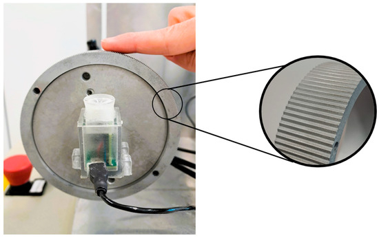 We used the same paradigm as in a previous study [23], asking the participants to discriminate between two velocities using dynamic stimuli to ensure more accurate perception [17]. We used tactile and auditory stimulation provided by two custom-made devices [24,25] (Figure 1). In particular, the tactile stimulation was delivered by a physical wheel (Figure 1) that contained a sinusoidal grating with a spatial frequency of 10 cycles/cm. The wheel moved in one direction (right or left randomly) during 500 ms and returned to the initial position in the following 500 ms. The speed of the movement varied between trials. The auditory stimulation was a 927Hz tone provided by the speaker of a MSI Caterpillar module [26] that was attached to the wheel (Figure 1). Both devices were operated using a custom MATLAB code (R2020b, The MathWorks, Natick, MA, USA). The sound duration of the sound matched the duration of the tactile stimulus.