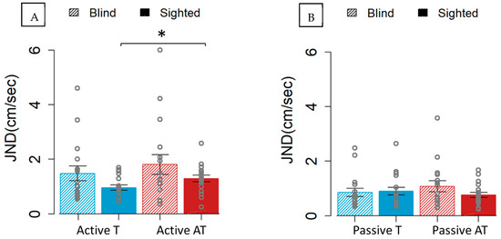 JND for the blind (45° lined boxes) and sighted individuals (full colored boxes) for the two sensory modalities. The blue color represents the tactile (T) sensory stimulus, while the red represents the audio–tactile (AT) sensory stimulus. (A) shows the JND obtained in the active condition. (B) illustrates the performance in the passive condition. Only the sighted participants had significantly worse precision in the presence of the non-informative sound during active movement when compared to only tactile feedback. * p < 0.05.