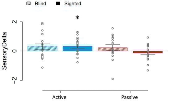 To support our results, we computed the SensoryDelta from the audio–tactile and tactile sensory stimulations (Figure 3) for both the active and passive conditions, and we compared it to zero. Here, as we expected, the only significant result was observed in the sighted group on the active condition (t(17) = 2.363, p = 0.03), which had a positive delta value (i.e., a higher JND in the bimodal sensory stimulation than in the unimodal one). This indicates that only the sighted participants presented a difference in the audio–tactile performance compared to the tactile one when a self-elicited movement was performed.