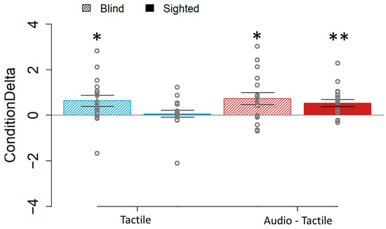 ConditionDelta values for the blind (45° lined boxes) and sighted individuals (full colored boxes) with the tactile (blue) and audio–tactile (red) stimuli. Compared to zero, the difference was significant for the blind group on the tactile and audio–tactile conditions. In the sighted group, it was only significant for the bimodal (audio–tactile) one. * p < 0.05. ** p < 0.01.