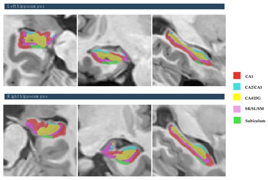 The study focused on eight subcortical structures, divided into right and left hemispheres: the putamen, caudate, pallidum, thalamus, hippocampus, amygdala, and nucleus accumbens, and lateral ventricles, as depicted in Figure 2. Also, this study focused on the five hippocampal subfields, divided into right and left hemispheres: cornu ammonis 1 (CA1), cornu ammonis 2 and 3 (CA2–CA3), cornu ammonis 4 and the granule cell layer of dentate gyrus (CA4-DG), the strata radiatum/lacunosum/moleculare (SR-SL-SM), and Subiculum, as depicted in Figure 3. The volumetric measurements of the global tissue estimation (GM, WM, and CSF), macrostructures (cerebrum, cerebellum, vermis, and brainstem), subcortical structures (putamen, caudate, pallidum, thalamus, hippocampus, amygdala, nucleus accumbens, and lateral ventricles), hippocampal subfields (cornu ammonis 1 (CA1), cornu ammonis 2 and 3 (CA2–CA3), cornu ammonis 4, and the granule cell layer of dentate gyrus (CA4-DG), strataum radiatum/lacunosum/moleculare (SR-SL-SM) and Subiculum) were extracted.