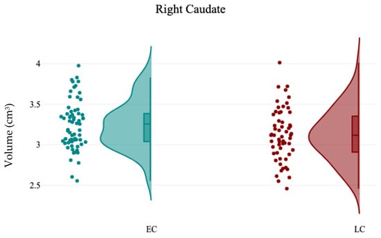 The raincloud chart shows the volumetric changes of right caudate between EC and LC groups.