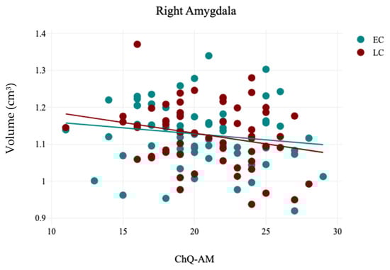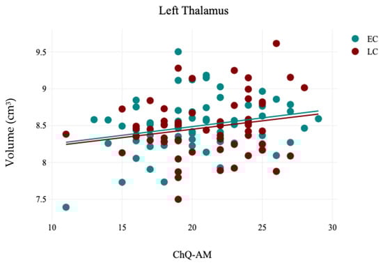 In contrast, the volumetric analysis of subcortical structures demonstrated a significant reduction in the volume of the right caudate for participants in the LC group (3.12 ± 0.32) compared to the EC group (3.24 ± 0.3), with t(121) = 2.13 and p = 0.03, as presented in Table 5 and Figure 4. No other significant differences were observed in the volumes of subcortical structures between the EC and LC groups. Additionally, the analysis of hemispheric laterality showed no significant difference in the Asymmetry Index (AI) between the EC and LC groups, as noted in Table 6. Correlation analysis between subcortical structures volumes and participants’ demographics revealed that the CHQ-AM significantly positively and negatively correlated with the left thalamus (r = 0.23, p = 0.01) and right amygdala volumes (r = −0.19, p = 0.03), as indicated in Table 7 and Figure 5 and Figure 6.