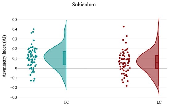 The raincloud chart shows the Asymmetry Index (AI) changes of Subiculum volume between EC and LC groups.