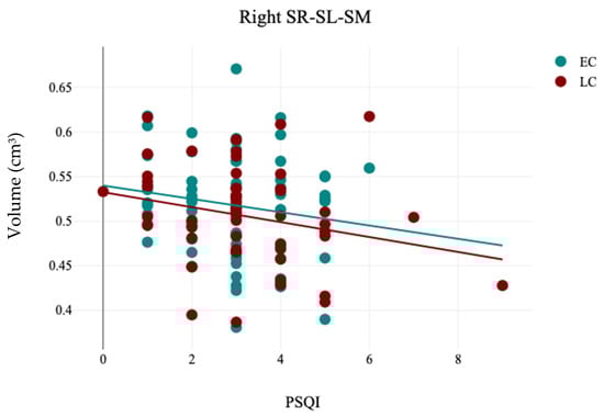 The results of the correlation analysis between PSQI and the volume of right hippocampal stratum (SR-SL-SM) in EC and LC groups.