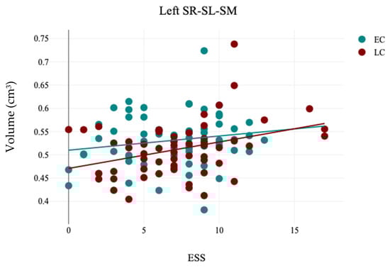The results of the correlation analysis between ESS and the volume of left hippocampal stratum (SR-SL-SM) in EC and LC groups.