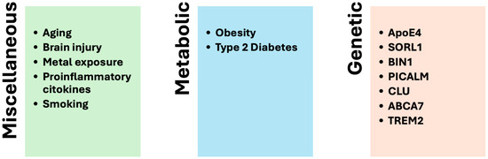 Alzheimer’s disease (AD) is the most common type of dementia worldwide and accounts for up to 70% of all dementia diagnoses [1]. Its incidence escalates significantly with age, and AD is classically classified into two primary forms: sporadic AD (SAD) (or late-onset AD) and familial AD (FAD) (or early-onset AD) [2]. SAD constitutes the majority of AD cases (over 90%), and it typically manifests after the age of 65. SAD represents a multifactorial disorder in which both environmental factors and genetic predisposition could contribute to the genesis of the disease [2]. Many risk factors have been linked to the development of SAD, including genetic predisposition, aging, exposure to metals, head injury, diet, mitochondrial dysfunction, vascular disease, immune system dysfunction, infectious disease, and genetic predisposition [3].