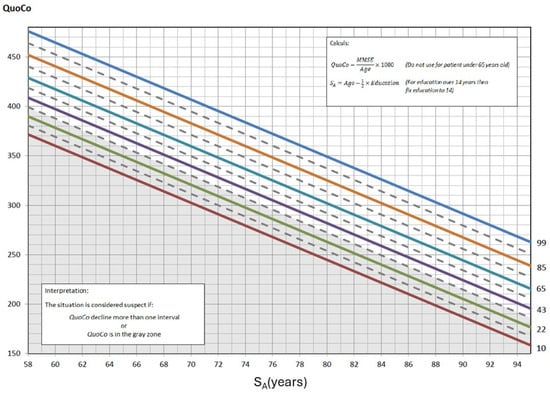 Mathematical equations used to derive the CCs are described in detail in our previous papers [,]. Here, we adjusted the age of each of the younger individuals to the threshold (threshold means ‘the lowest value permitted by the CC model so the model remains valid’) value of 60 (CC-MoCA) or 65 (CC-MMSE). This adjustment does not alter the CC but rather restores each individual’s cognitive performance to the threshold age. For longitudinal tracking, this implied that a patient may have two scores at the same Standardized Age, if both ages of the patient were below the threshold. The rules regarding intervals applied similarly to the current method (i.e., the vertical descent should not exceed the intervals already established on the CC to remain in a normal state). We conducted a performance validation to ensure suitability of this approach using CCs for younger elderly individuals. We compared the average MoCA and MMSE scores between individuals below the age threshold and those at the age threshold. Additionally, we performed a thorough analysis to assess the influence of age on the QuoCo scores and measured its impact below the age requirement. We employed linear regression analysis to examine the relationship between QuoCo and age for both the MoCA and MMSE assessments, specifically focusing on younger individuals. We compared this regression analysis with that of individuals above the age threshold. We evaluated the statistical performance (SE, SP, and Youden’s index) of the tool and, specifically, patients older than the threshold for tool use. Youden’s index, which combines both the SE and SP of the test, served as a fair comparison point for our analysis. We postulated that, if performances were comparable or superior, the method was valid and CCs could be used for younger patients.