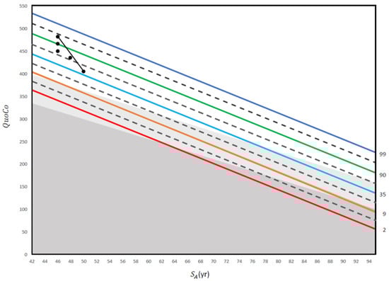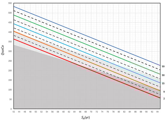 The Cognitive Chart MMSE (CC-MMSE). Each solid parallel line represents a percentile: 99th percentile (blue), 85th percentile (light brown), 65th percentile (turquoise), 43rd percentile (purple), 22nd percentile (green), and 10th percentile (red). These colors were chosen from color palettes for color blindness. The grey zone at the bottom represents the cutoff zone. Points on the chart at baseline that fall within the cutoff zone (or any single point within that zone) or, subsequently, that represent a decline greater than the allotted width of 1 percentile zone from the initial measurements, indicate potential cognitive problems. Note: QuoCo, Cognitive Quotient; SA, Standardized Age [].