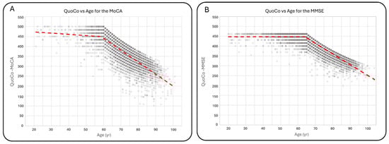 For individuals under 60 years old, there was a decrease of 0.609 ± 0.200 QuoCo per year compared with a decrease of 6.025 ± 0.066 QuoCo per year for individuals over 60 years old. For the MMSE, there were no significant differences in scores between individuals under 65 years old and those aged 65 years. The mean MMSE score for individuals under 65 was 29.1 ± 1.2 (n = 2936), comparable to the score of 29.1 ± 1.3 (n = 482) for individuals aged 65 years. QuoCo score analysis based on age further supported these findings, showing minimal variation in QuoCo scores for the MMSE in individuals below the age limit. The rate of QuoCo-MMSE variation with respect to age under 65 years old was +0.00267 ± 0.00758 QuoCo per year, while for the group aged 65 years and older, it was −5.396 ± 0.029 QuoCo per year. Figure 3 illustrates the QuoCo scores for different age groups, highlighting the age-related trends in cognitive performance for the MoCA (Figure 3A) and for the MMSE (Figure 3B).