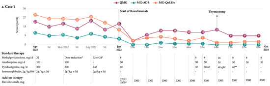 Her daily activities were significantly impaired due to persistent muscle weakness and fatigue. Additionally, prolonged high-dose prednisone therapy resulted in corticosteroid-induced myopathy and dyslipidemia. In April 2022, at the age of 18, she was referred to our clinic with a moderate-to-severe weakness affecting the proximal upper and lower limbs, trunk, and cervical muscles. She also exhibited mild-to-moderate bulbar dysfunction, asymmetric ptosis in both eyes, and diplopia. Electromyography (EMG) revealed a 30% decrement in the proximal upper limbs, with clinical evaluations yielding a QMG score of 23, MG-ADL of 12, and MG-QoL15r of 30 (Figure 1a). Prednisone was replaced by methylprednisolone in an attempt to provide faster and more effective symptom relief. Additionally, azathioprine, along with repeated cycles of IVIg, was introduced for the treatment of gMG. Despite symptom improvement with immunoglobulin treatment, the patient experienced two severe exacerbations within 6 months; in July 2022, she presented with a generalized exacerbation, primarily characterized by significant limb weakness (Figure 1a). EMG demonstrated a myasthenic decrement at the facial level and a chronic mild, asymmetric involvement of all four limbs with myogenic features. Clinical assessments recorded a QMG score of 24 and MG-ADL of 11. Due to worsening symptoms, a new cycle of IVIg was initiated; however, the clinical improvement observed outside the exacerbation periods remained minimal (Figure 1a).