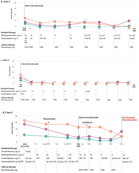 A 26.8-year-old female (height: 160 cm; weight: 61 kg) diagnosed with AChR-positive gMG in 2019 was admitted to our department for the continuation of treatment. Her disease-specific symptoms started in 2016 with dysphonia, which progressively worsened to severe hypophonia, swallowing disorders, and muscle weakness, predominantly in the proximal limbs. An MG diagnosis was confirmed in 2019 following a severe exacerbation that required orotracheal intubation (OTI) with mechanical ventilation and thymectomy was performed in 2020. Other disease characteristics are included in Table 1. For approximately 2.5 years after diagnosis, she experienced severe disease exacerbations, including episodes of dysphonia, dysphagia, generalized muscle weakness, and reduced respiratory tolerance to exercise. She received four cycles of IVIg alongside high doses of pyridostigmine and glucocorticoids. Although these therapeutic interventions determined transient symptomatic relief, the patients’ MG-ADL score dropped 5 points (from 10 to 5), but the MG-QoL15r score remained elevated (from 30 to 21), indicating a substantial impact of the disease on quality of life (Figure 1d). No immunosuppressive therapy was initiated during this period, as the patient declined further treatment. Additionally, glucocorticoid treatments led to complications, such as anxiety disorders, insomnia, and recurrent oral candidiasis.