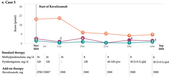 QMG score reductions varied with disease severity. Case 1 showed a significant decrease of 7 points (from 21 to 14) at 26 weeks after ravulizumab initiation, followed by a drop of −6 (from 15 at 64 weeks, when the patient underwent thymectomy, to 9 at 90 weeks). The improvement in myasthenic deficits achieved with ravulizumab allowed the patient to undergo surgery without the risk of a myasthenic crisis. This patient was the only one who underwent thymectomy while receiving ravulizumab therapy. A notable reduction (−9) was recorded in case 3 (from nine to zero) throughout the follow-up period. Case 5’s score dropped by four (from five to one) at 26 weeks but increased slightly (+2) at 43 weeks. The slight increase in the QMG score for this patient may be attributed to lifestyle changes, including increased physical activity and greater professional and social engagement.
