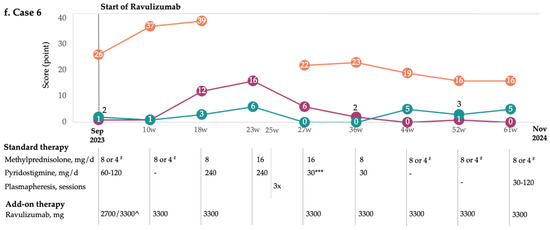 No adverse events related to ravulizumab or disease exacerbations requiring additional rescue treatments were reported in five of the six patients in our case series. One patient experienced adverse events associated with ravulizumab, including vomiting, diarrhea, and chills, which resolved within 24 h following symptomatic management. The occurrence of severe diarrhea and nausea was also reported at similar rates among MG patients in the CHAMPION-MG trial, regardless of whether they received ravulizumab treatment or a placebo [17]. Given that our patient also experienced two to three episodes of myasthenic exacerbations during treatment, the patient discontinued ravulizumab therapy and required a rescue cycle of IVIg. It is noteworthy that in our patient, MG had significantly worsened three years before initiating ravulizumab, with episodes refractory to standard treatments. Moreover, in other patients who continued ravulizumab treatment, a reduction in the doses of standard oral medications for MG was observed during a follow-up period of up to 1.7 years. The doses of cortisone and acetylcholinesterase inhibitors were adjusted individually based on the clinical response and severity of symptoms. Corticosteroid therapy was gradually tapered after the disease stabilized, aiming for the minimum maintenance dose on an alternating schedule.