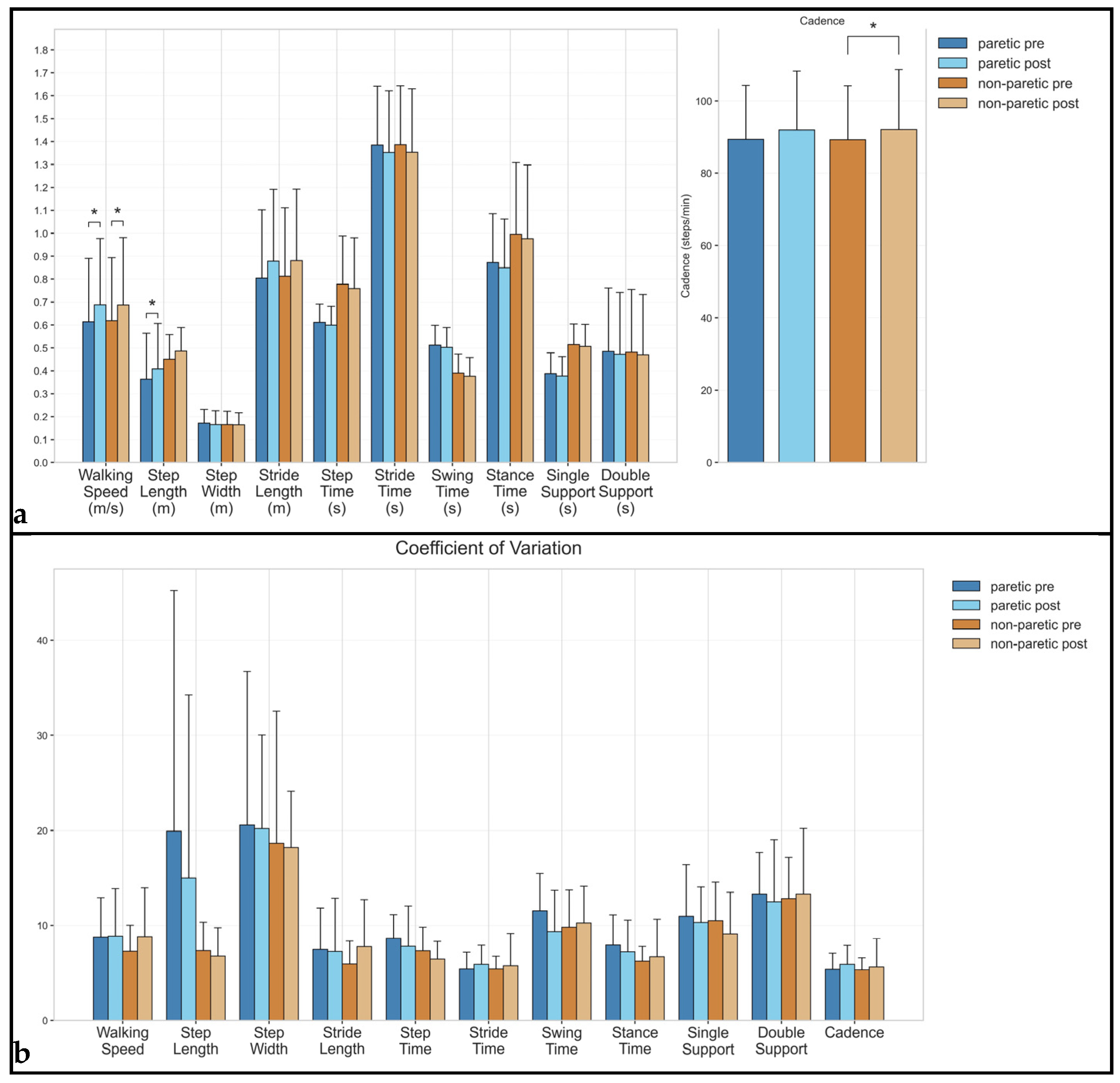| Cadence | paretic | 89.35 (60.65–112.91) | 91.92 (60.27–119.23) | 0.16 | 0.147 | 5.37 (3.59–8.40) | 5.91 (3.60–9.98) | 0.28 | 0.365 |