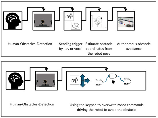 Indirect control: In this setup, the human participant acts as an auxiliary sensor that complements the robot’s onboard sensors. When the participant detects an obstacle that the robot’s sensors have missed, he/she triggers a signal. This signal initiates a process where the system estimates the obstacle’s location relative to the robot and integrates this information into the robot’s path-planning algorithms. The user interaction is simplified to pressing a key or issuing a voice command, making it accessible and straightforward [5].